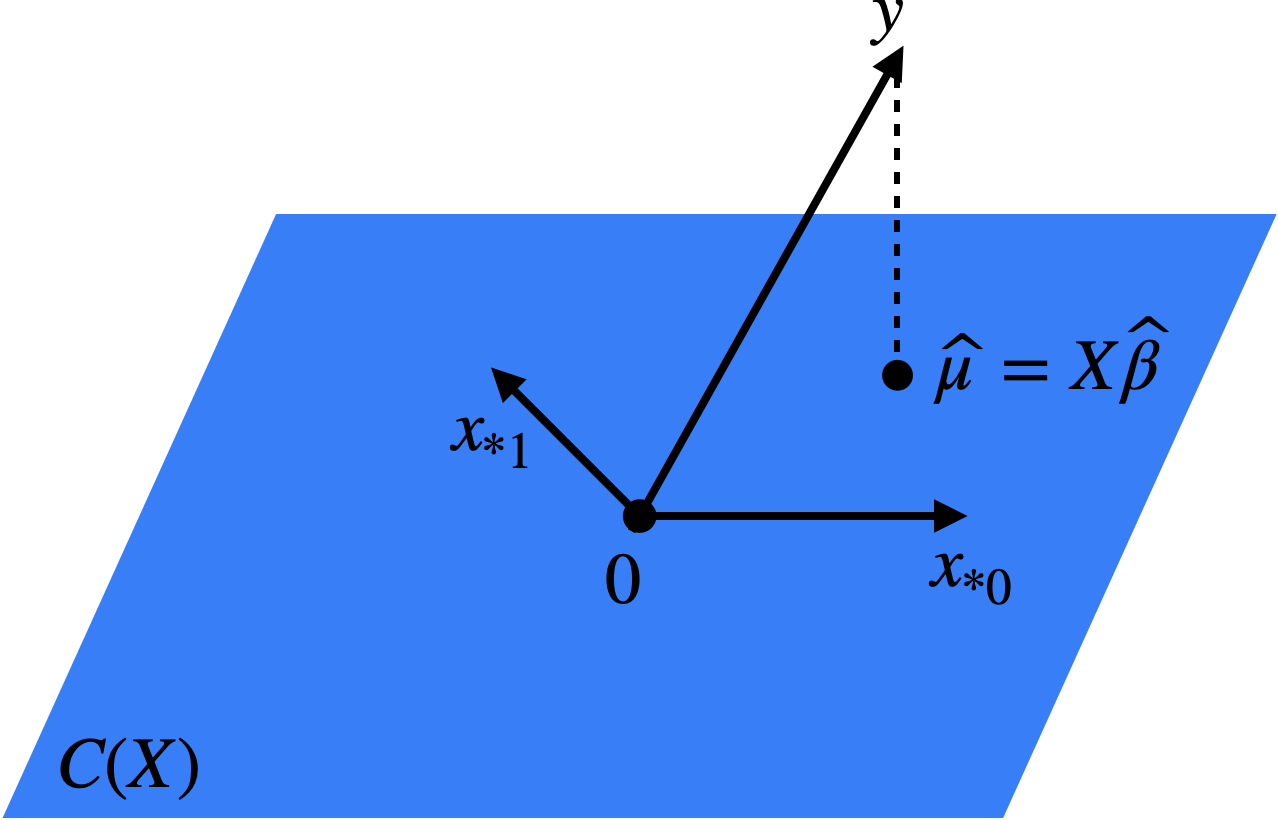 Proposition 3.1 The mapping \(\boldsymbol{y} \mapsto \boldsymbol{\widehat{\mu}} = \boldsymbol{X}\boldsymbol{\widehat{\beta}} \in C(\boldsymbol{X})\) is an orthogonal projection onto \(C(\boldsymbol{X})\), with projection matrix