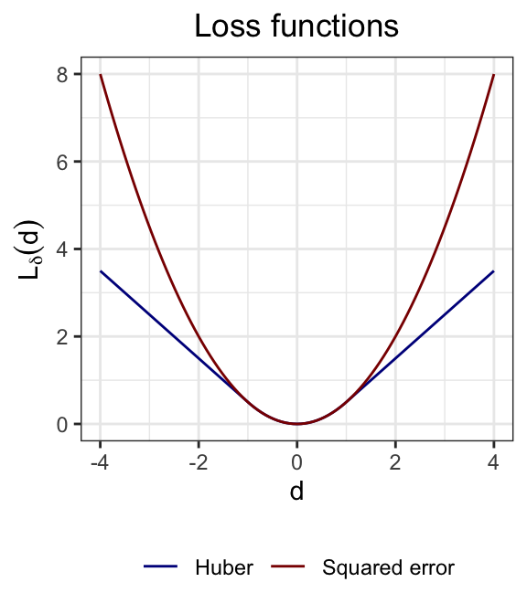 With an estimate of \(\sigma\) in hand, we can use the Huber loss function to estimate \(\boldsymbol{\beta}\): \[ \boldsymbol{\widehat{\beta}}^{\text{Huber}} \equiv \underset{\boldsymbol{\beta}}{\arg \min}\ \sum_{i = 1}^n L_\delta\left(\frac{y_i - \boldsymbol{x}_{i*}^T \boldsymbol{\beta}}{\widehat \sigma}\right). \]